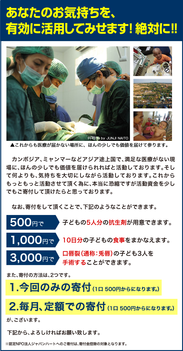 皆さんも、よろしければ下記にジャパンハートさんへの寄付ページとリンクしておきますので、よろしければ是非。